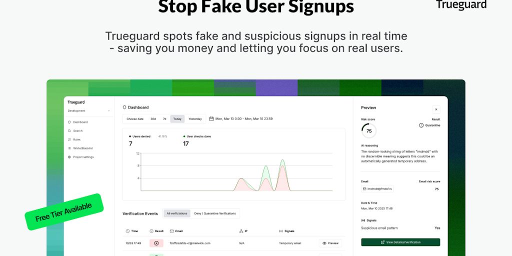 Trueguard delivers advanced protection against malicious users for your SaaS. Automatically blocking temporary emails, free-tier abusers, automated bots, and other threats.