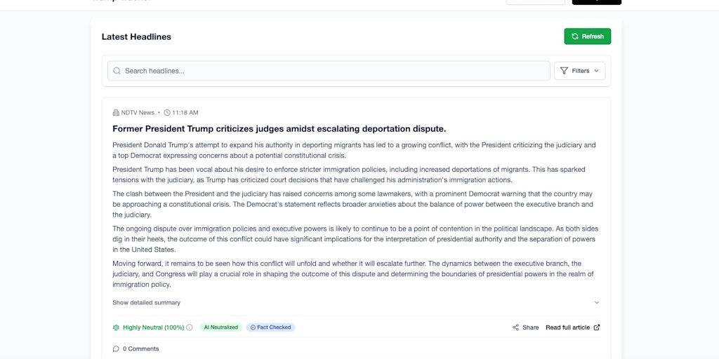 Whether you follow Trump closely or just want balanced coverage, our AI-driven platform delivers the latest headlines without the polarizing rhetoric. We continuously scan leading news sources, then a