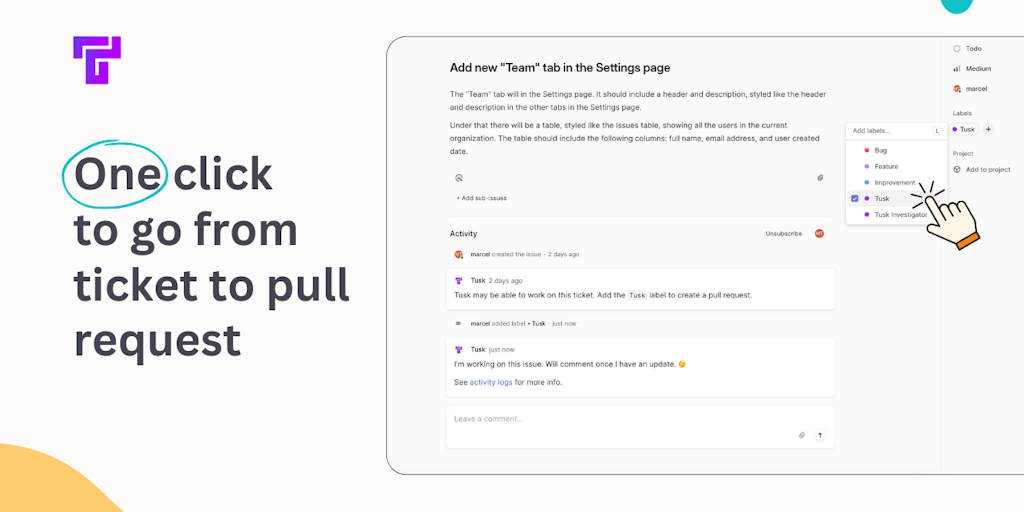 Tusk is an AI agent that helps product teams complete UI changes from ticket to pull request. Automate away grunt work like minor bug fixes and copy changes to increase customer NPS without bothering