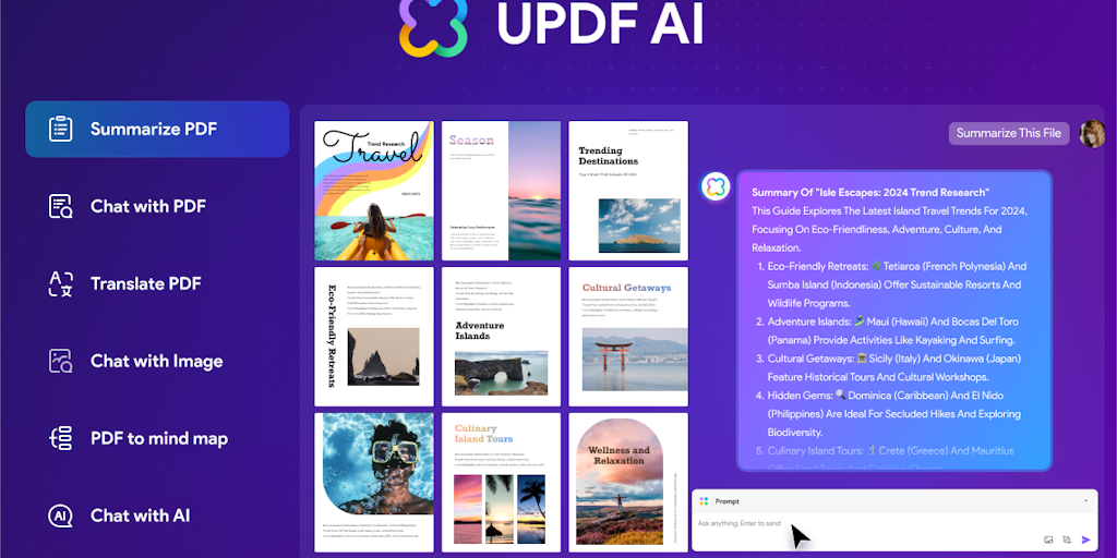 UPDF AI transforms your PDF experience with cutting-edge AI. Chat with PDFs, ask questions, and enhance productivity. Easily summarize, translate, chat, convert PDFs to mind maps and chat with images