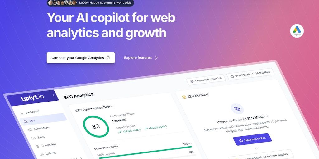 Uplyt is your AI copilot for web analytics and growth. Connect GA4, Google Ads, Meta Ads and more to turn complex data into clear, actionable insights. Collaborate with your team (or clients), assign