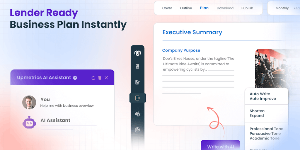 Upmetrics is an AI-powered business plan software that simplifies planning for entrepreneurs and teams with our intuitive tools. Create comprehensive business plans, accurate financial forecasts, enga