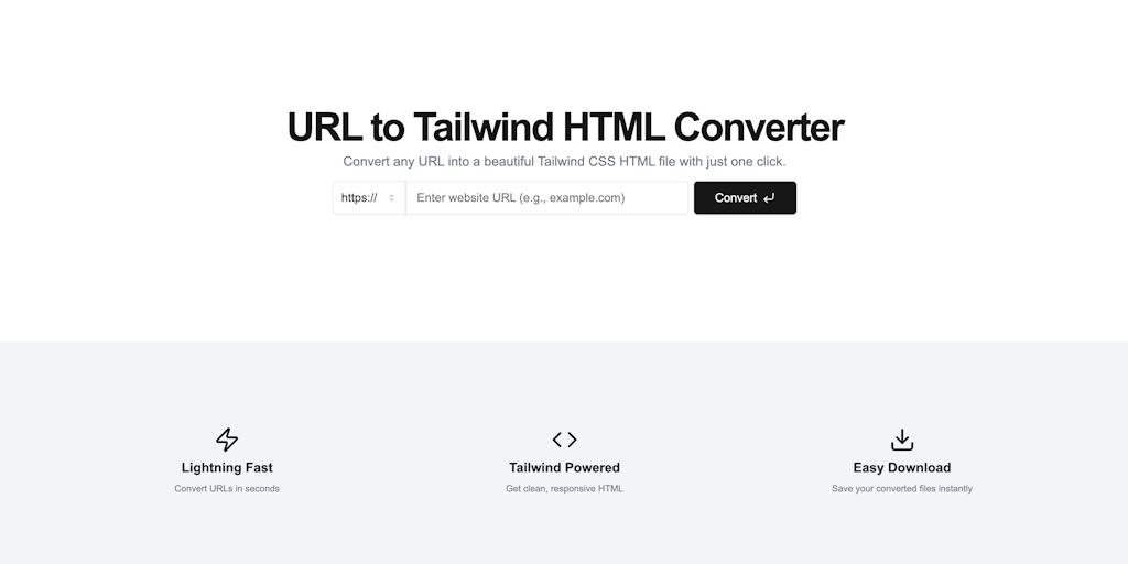 Convert any URL into a beautiful Tailwind CSS HTML file with just one click. Fast, easy, and powerful.