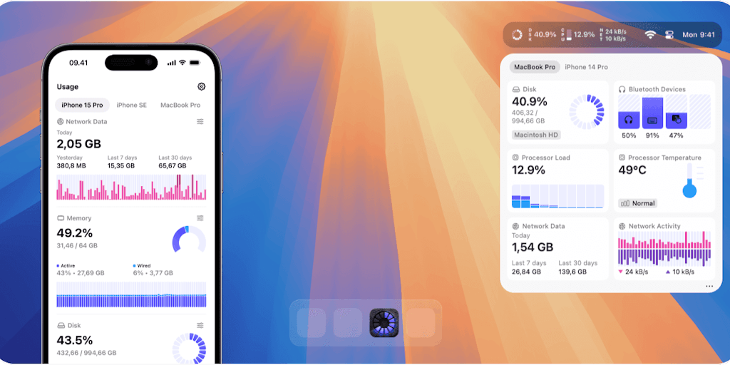The monitoring app you deserve! • Comprehensive system monitoring (CPU, RAM, disk, network, GPU, fans and more) • Menu Bar support • Beautiful widgets • Sync via iCloud • Lightweight performance impac