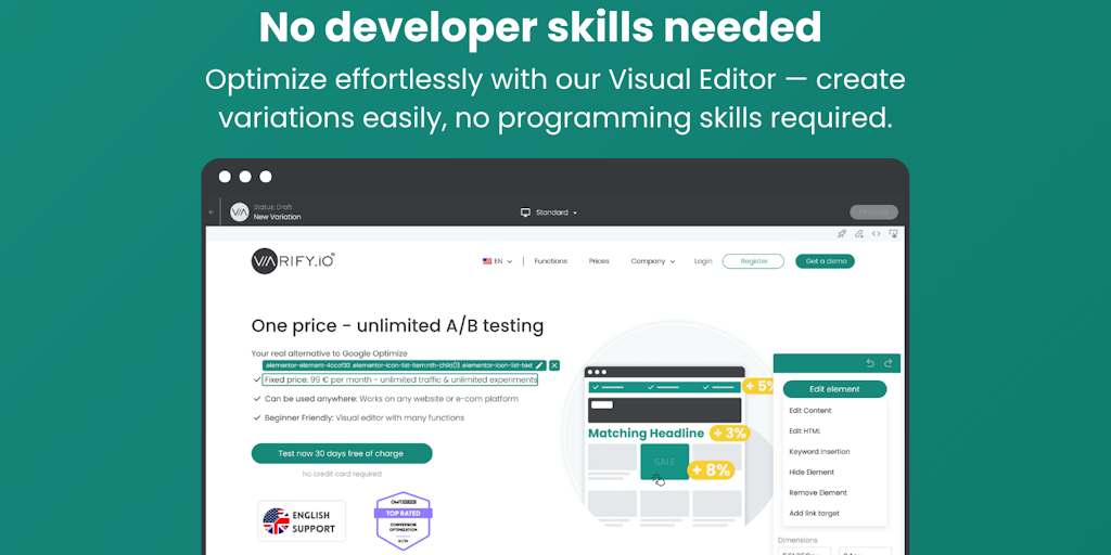 Varify.io, Google Optimize's successor, offers unlimited experiments, traffic, and team members for a fix price of 99€/month. Enjoy a 30-day free trial, no credit card needed. Create A/B tests with a