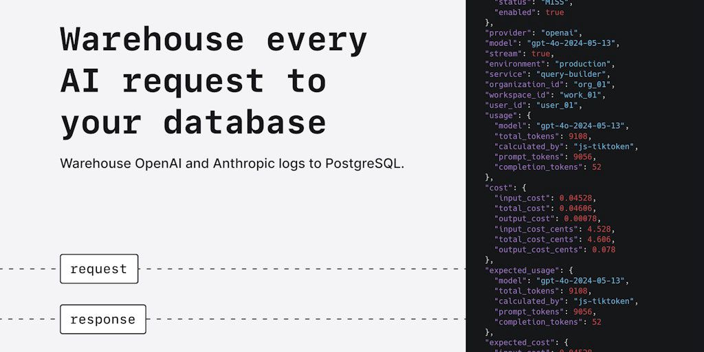 Warehouse every AI request to your database. Query logs to analyze usage and costs, evaluate models, and generate datasets. Install the proxy with 2 lines of code. It’s free to get started, and you ow