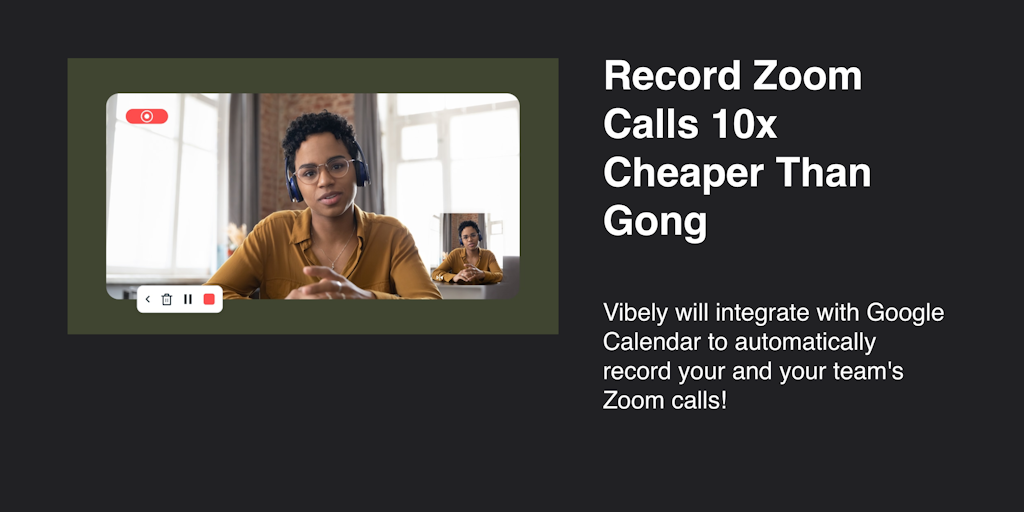 Vibely will integrate with Google Calendar to automatically record your and your team's Zoom calls! 10x Cheaper than Gong!