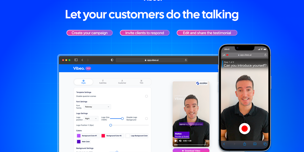 Transform customer feedback with Vibeo AI. Effortlessly create campaigns, send links, and collect authentic video testimonials. Our AI enhances your video, boosting credibility and engagement. Turn te
