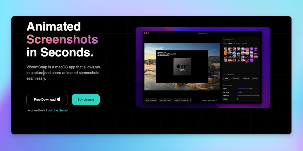 Enhances your storytelling through animated screenshot, add gradient background, images or video. Whether for presentation, social media posts, or engaging content creation, VibrantSnap provides the t