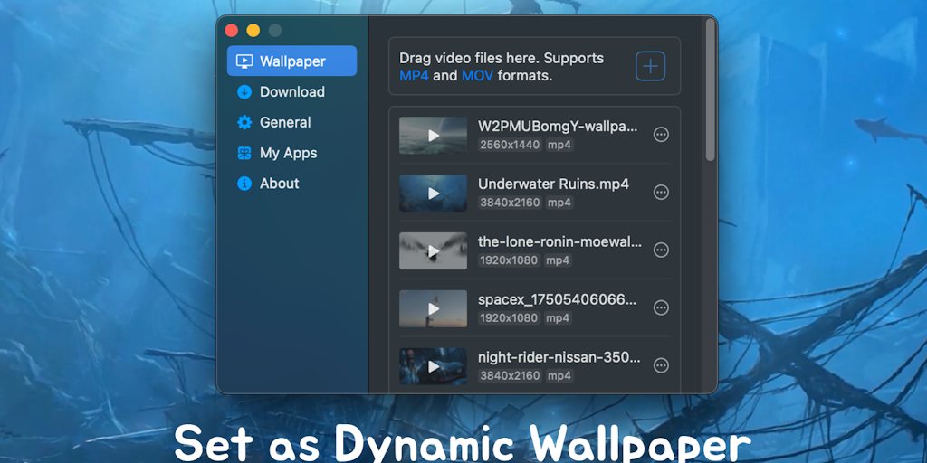Set 4K videos as dynamic desktop wallpapers, supporting MP4 and MOV formats. Simply drag and drop the video into the app, click to set it as your dynamic wallpaper. Make your desktop more lively and f