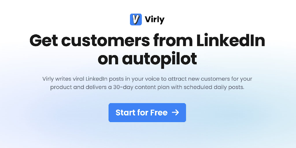 Virly writes viral LinkedIn posts in your voice to attract new customers for your product and delivers a 30-day content plan with scheduled daily posts.
