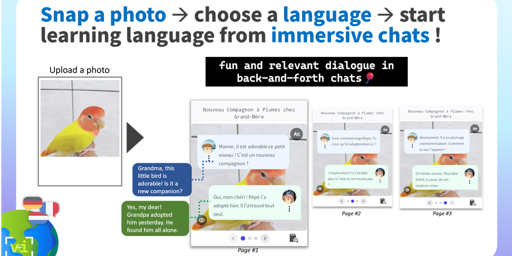 VISEAL turns photos into everyday language chats using agentic AI. Snap a photo – it generates back-and-forth dialogues from the scene. Learn language in a more natural and relevant way, let it emerge
