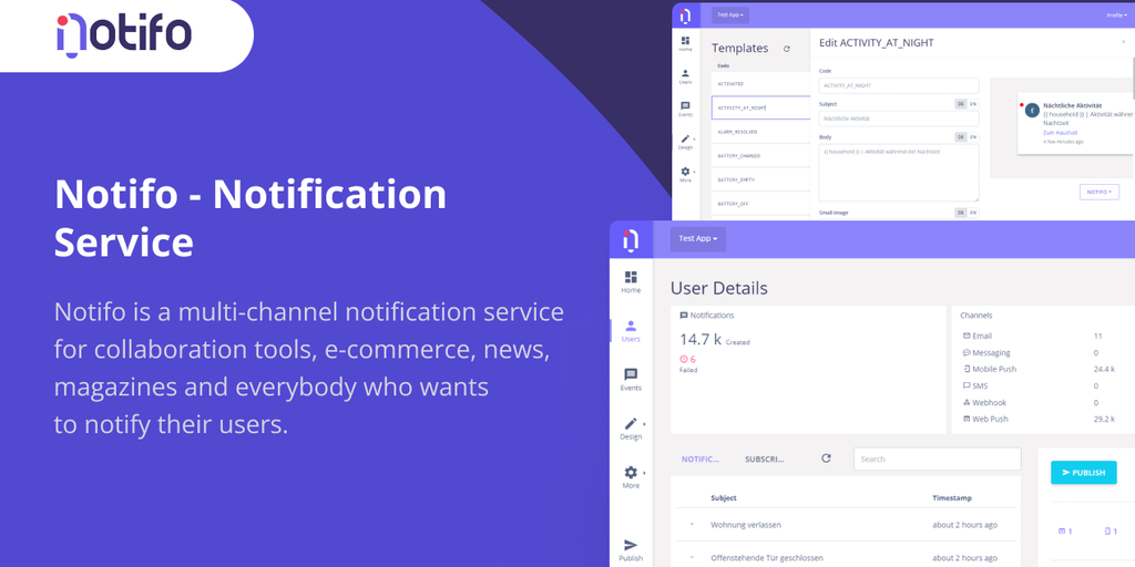 Notifo is an Open Source notification server for all channels. It handles the reliable delivery of notifications through emails, mobile push, web push, sms, messaging and APIs. A web plugin can be emb