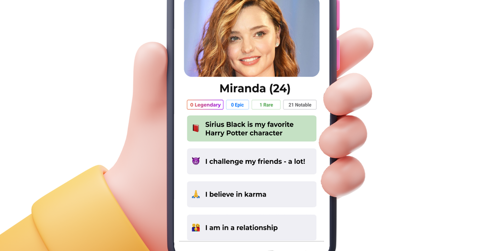 Swipe cards on different topics and then get matches based on values, humor, and so on. I've attached an example. Thanks in advance for your support and I hope you’ll find some cool people out there.