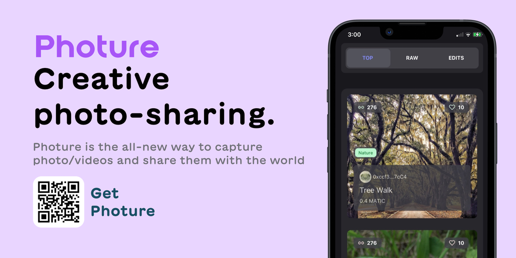 Photure is a photo and video sharing app built on top of NFT's minted on the Polygon chain. Using Photure, you can easily insert stickers, emoji, filters and more to your pics, make awesome collages,