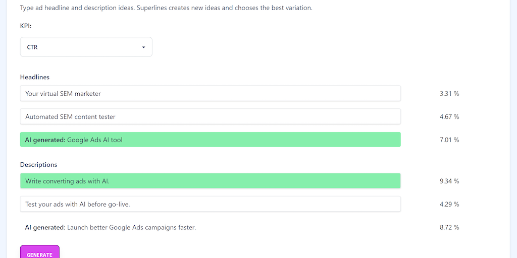 Superlines is a Google Ads content tool that uses your own account data and prediction algorithms to pre-test your ad ideas in seconds. It also writes additional ideas with GPT-3 and ranks them automa