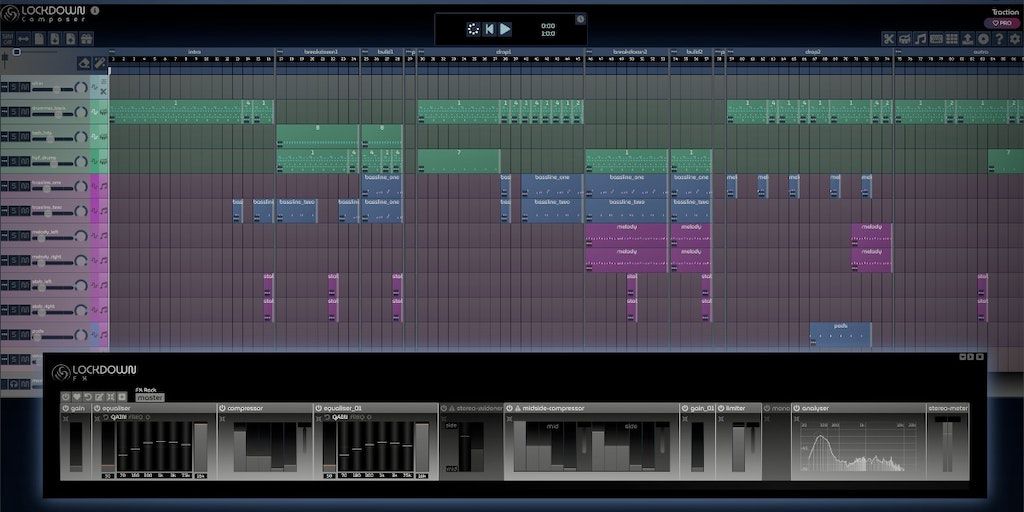 Lockdown Composer is a web-based DAW that lets you create electronic dance music online and offline. It includes a large collection of synths, instruments and FX units and also integrates with Freesou