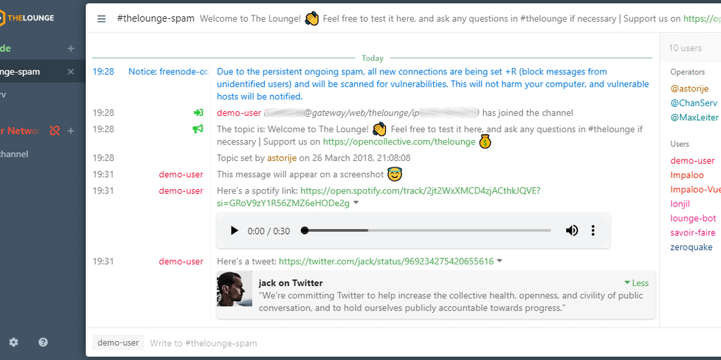 Push notifications, link previews, message searching, and more bring IRC to the 21st century. Stay connected while you are offline, and resume right where you left off. The Lounge is open-source and d