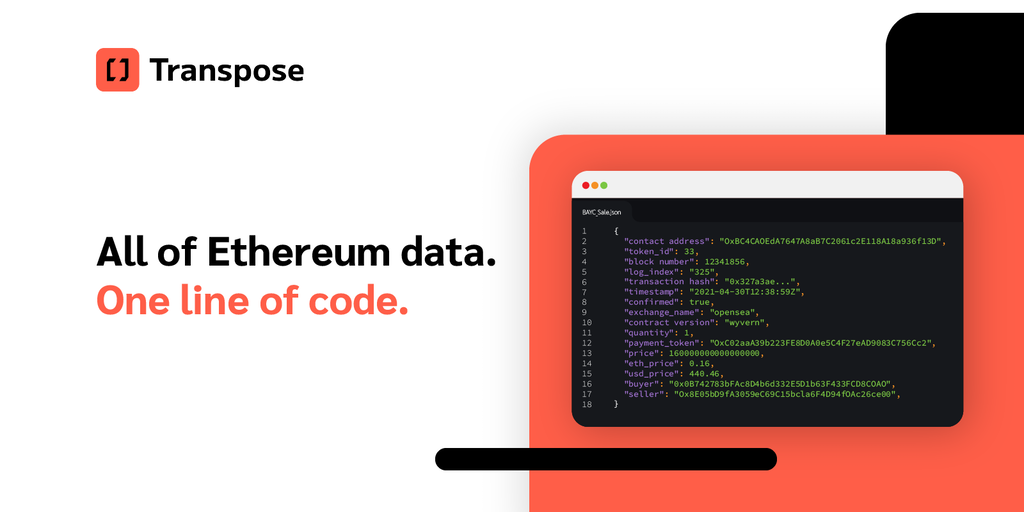 Whether you’re building a game with NFT prices, a tool to track ENS name registrations, a wallet to display token balances, or need to instantly retrieve all events fired by a contract, Transpose has