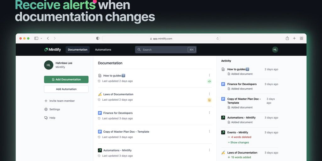 Imagine a personal documentation manager that routinely reviews your docs and tells you when it needs to update Eliminate documentation debt with Mintlify 🚨 Receive alerts when docs change (or shoul