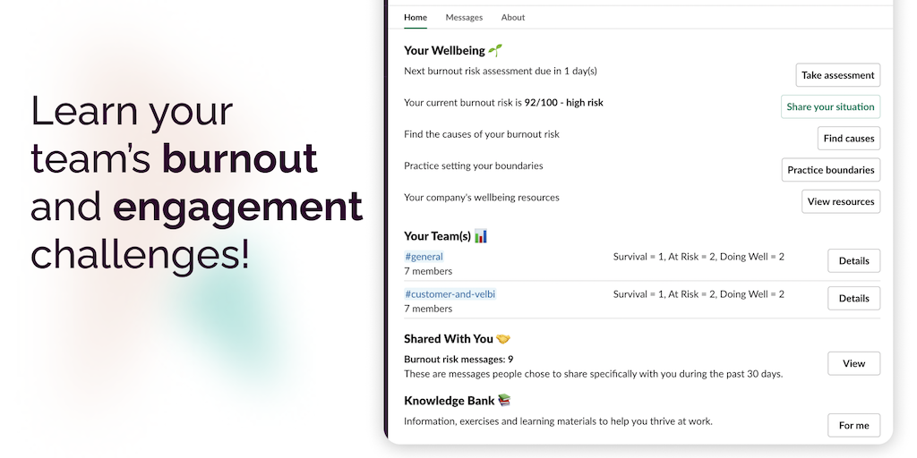 Hi! I'm Linda from Velbi, a Slack App that prevents burnout and improves employee engagement, productivity, and happiness with 16 mini-tests that are 1 minute long. Tests are based on global wellbeing
