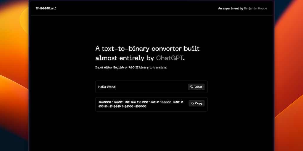 01100010.wtf is a simple text-to-binary converter made primarily by ChatGPT. The purpose is to demonstrate just how easy it is to generate production code with OpenAI's new tool.