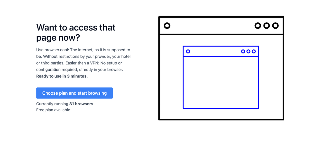 You want to access a website. But your hotel or provider blocks that page? Visit browser.cool and start a new browser instance in the country of your choice. No configuration required, ready in 3