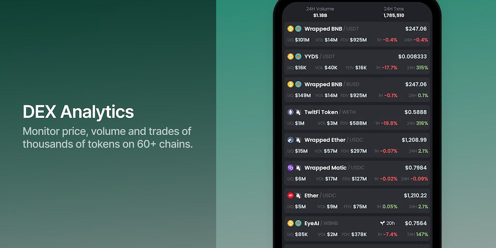DEX Screener is a powerful and easy-to-use blockchain analytics platform, tracking 60+ chains, hundreds of DEXes and over a million trading pairs. Features include customizable screeners, realtime cha