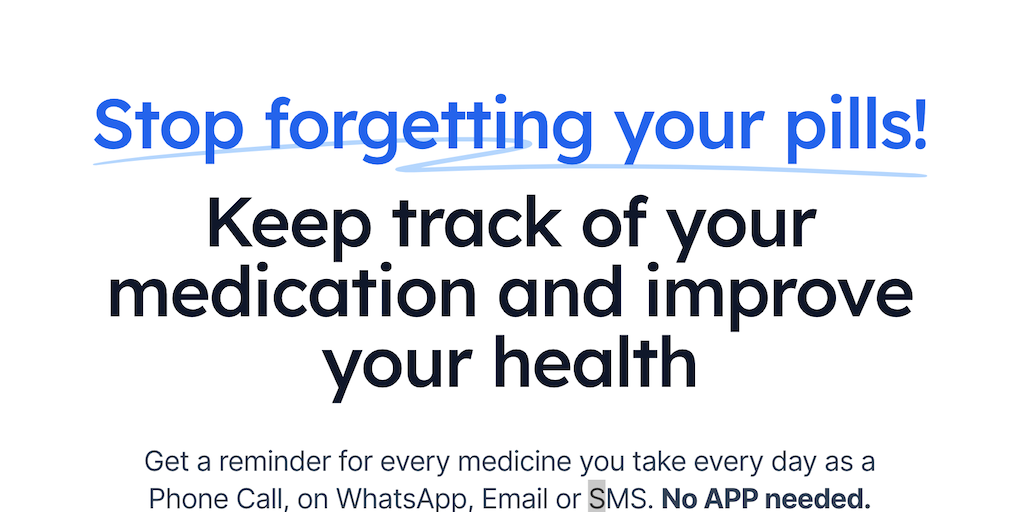 Forgetting pills can be dangerous. Keep track of your medication and improve your health. Get a reminder for every medicine you take every day as a Phone Call, on WhatsApp, Email or SMS. No APP is nee