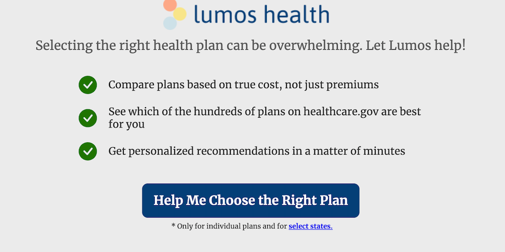 Lumos finds the ACA plans that are right for you in minutes. We recommend plans based on true-cost, which accounts for a plan's premiums and your estimated out-of-pocket expenses under that plan. Shop