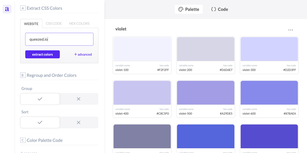 A web-based tool for extracting colors from a chosen website or an existing CSS code; it also regroups/orders colors and gives you, in the end, a CSS/Sass colors palette.