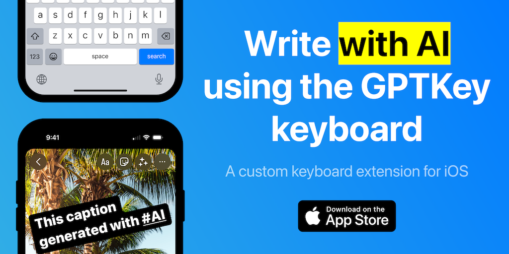 GPTKey is an iOS app and custom keyboard extension that lets you use AI to write unique and creative tweets, captions, emails, notes, and more using the same technology that powers OpenAI's ChatGPT.