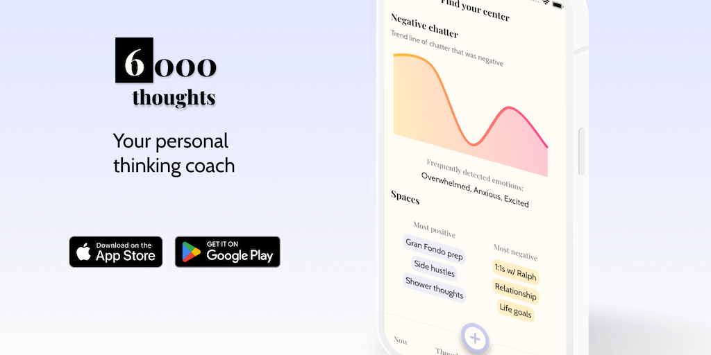 Your personal life coach, by your side - 24/7. 6000 thoughts makes sense of the stories you tell yourself and helps you get unstuck. Achieve faster breakthroughs than journaling or meditation. Cultiva
