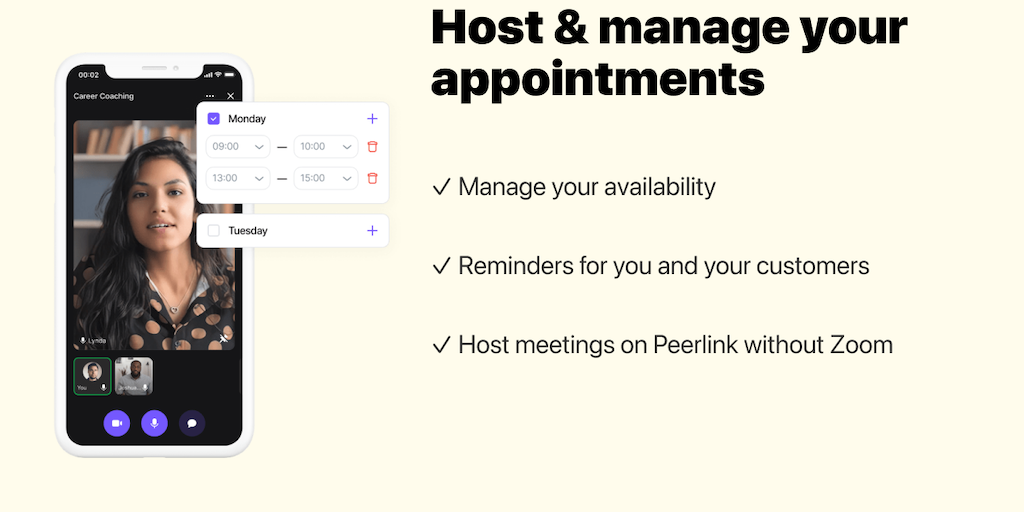 Peerlink is the simplest way to build a webpage for your coaching business, sell 1:1 programs online, and manage appointments with your customers.