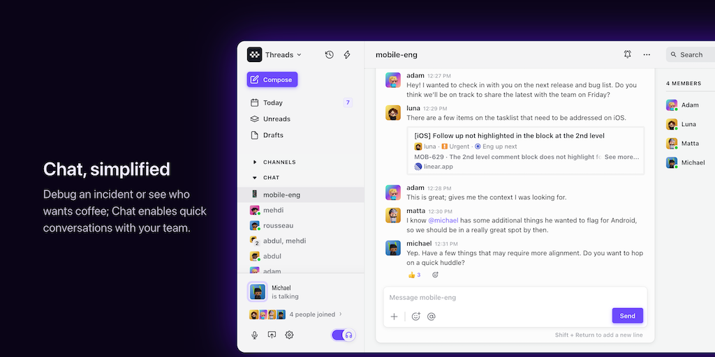 Cut chat in half. Introducing Threads, a Slack replacement designed for makers. Threads provide a simple, focused canvas for sharing your work and getting rich feedback in return.
