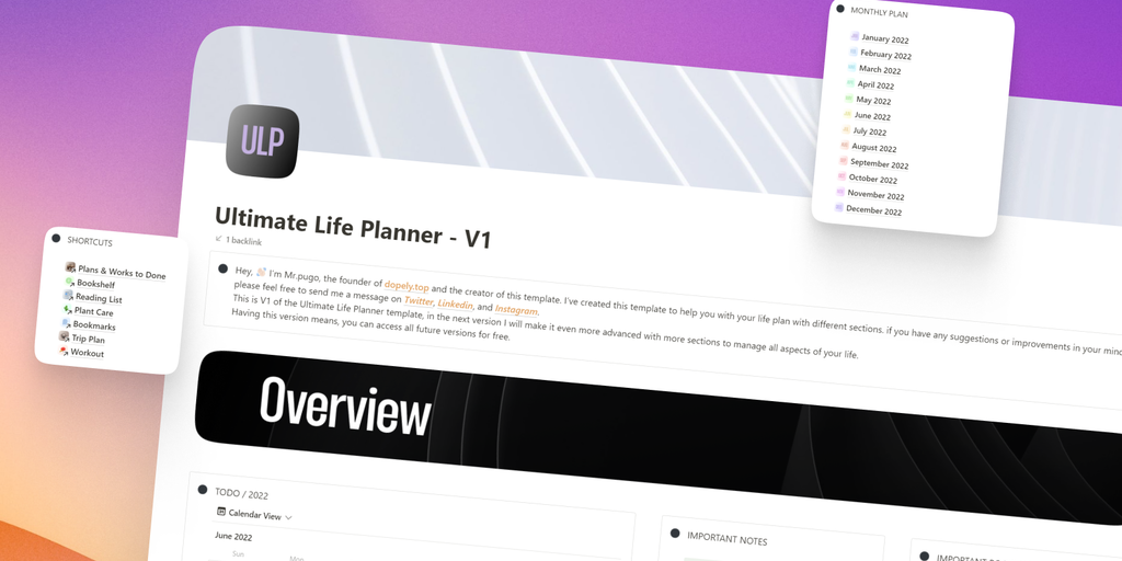One Place to Manage Everything in your life together entirely in Notion. Ultimate Life Planner seamlessly brings tasks, notes, plans, health, plant care, and travel plans to Notion.