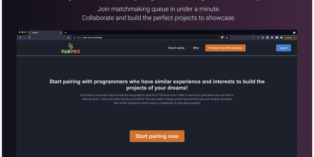 PairPro is a quick match-making system that connects you with developers of similar experiences to collaborate and build projects. Pair up and start building!