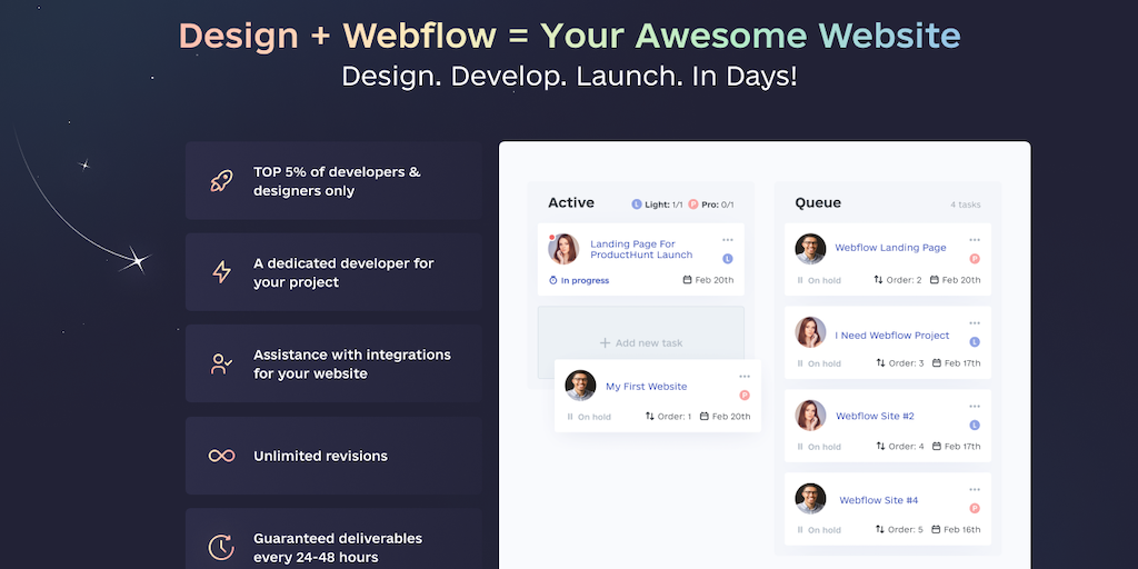 Get everything you need for design and Webflow development in one app with Awesomic’s all-in-one plan for startups. Logo design, landing page design, Webflow dev, and much more for one flat monthly fe