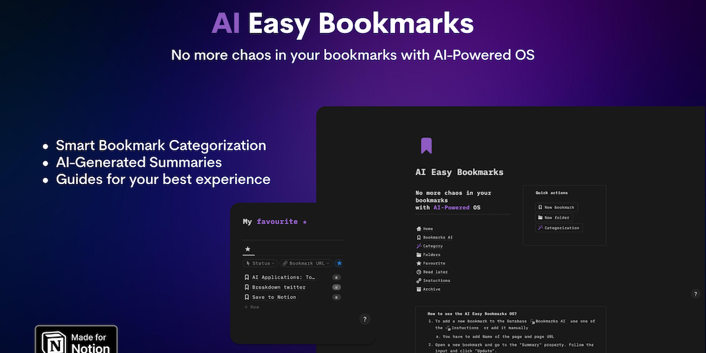 No more chaos in your bookmarks with AI-Powered OS. Effortless bookmarking with AI categorization and instant summaries.