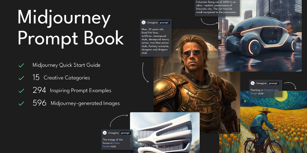 Fuel your imagination with Midjourney Prompt Book. Over 590 AI images (with exact prompts) spanning 15 diverse categories: from unique styles like low poly, to master painters like Dali, renowned arch