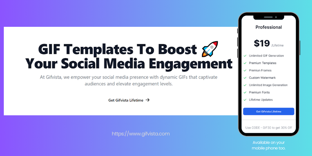Gifvista is a collection of pre made GIF templates to help you create engaging GIFs in just under a minute which you can use for your growth on different social media platforms. You pay once and you g