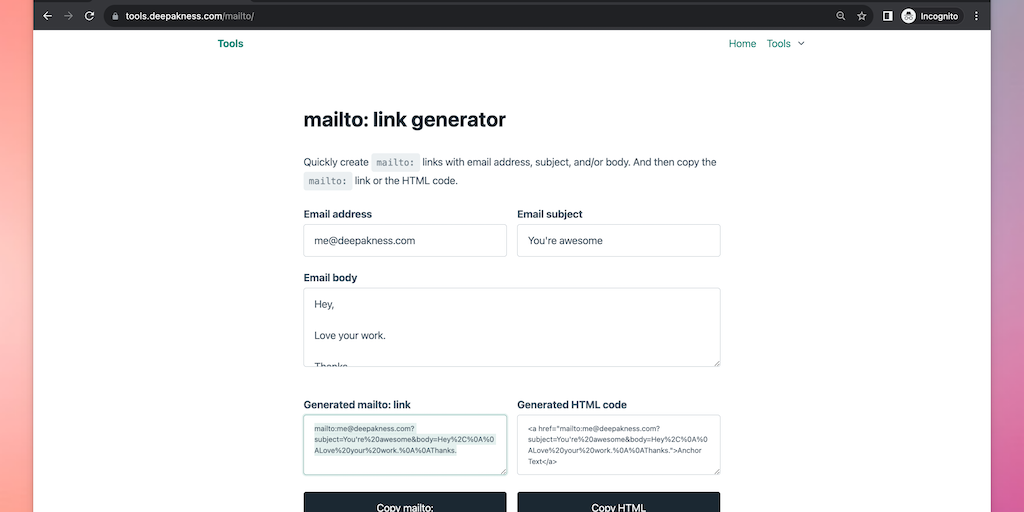 Quickly create mailto: links with email address, subject, and/or body. And then copy the mailto: link or the HTML code.