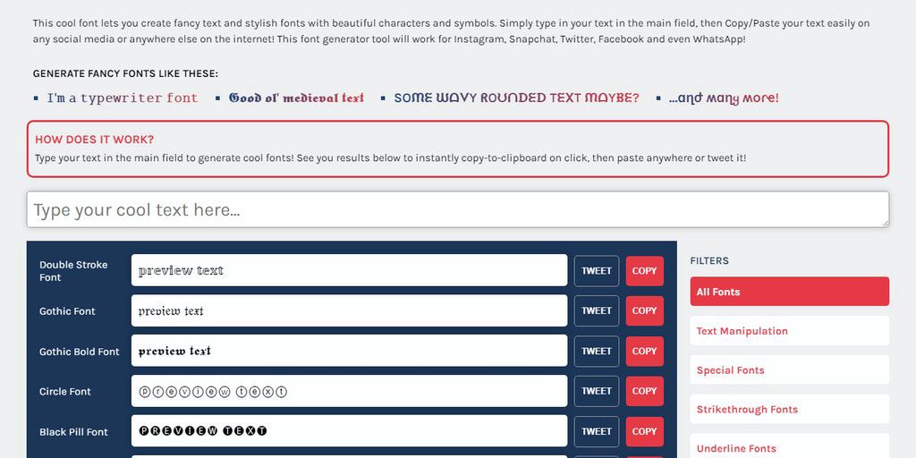 This cool font lets you create fancy text and stylish fonts with beautiful characters and symbols. Simply type in your text in the main field, then Copy/Paste your text easily on any social media or a