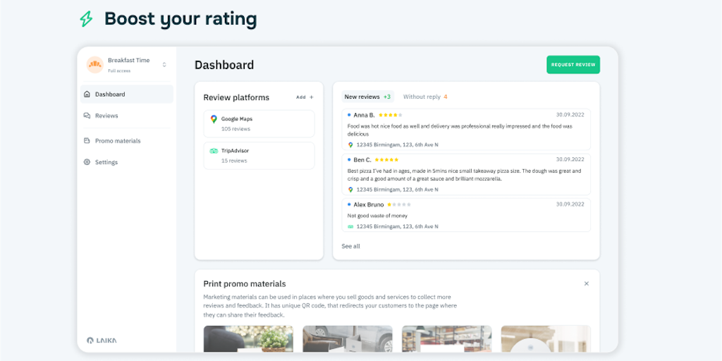 Laika is an easy-to-use tool created for overlooked small businesses to seamlessly collect customer reviews from real customers to help you get that coveted 5-star rating on Google Maps, Tripadvisor,