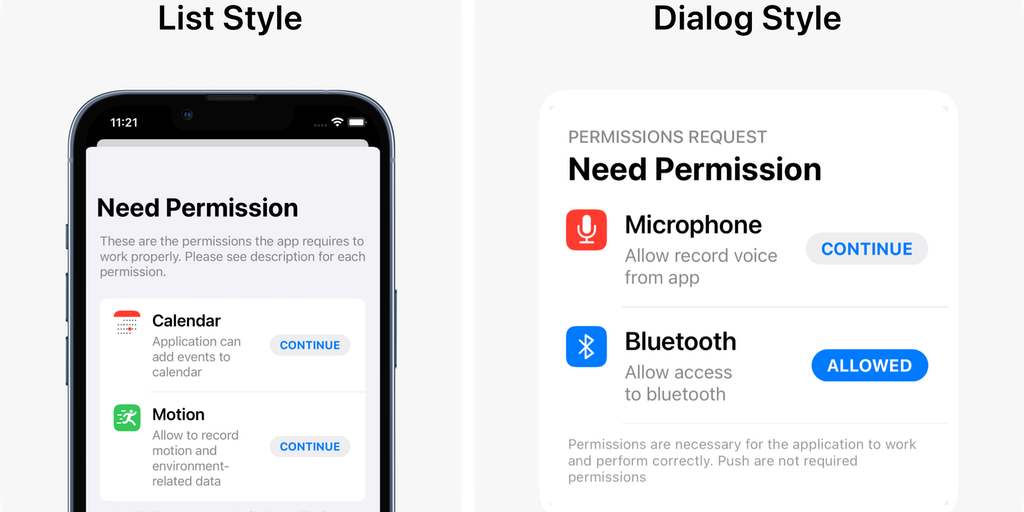 Availalbe three ready-use interface - list, dialog & native. Supports iPad, dark mode and has ready localizations. Also you can check state of permissions, available areauthorized,denied ¬Determine