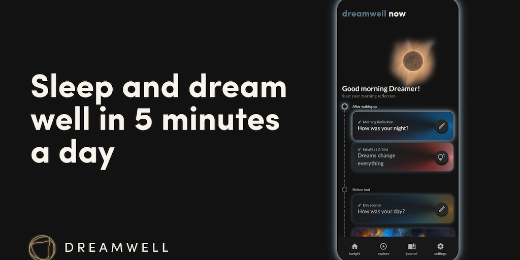 DreamWell is a mobile app for developing the habit of sleeping, dreaming, and living well through simple actions you take each day. It includes morning and evening reflections, data-driven dream analy