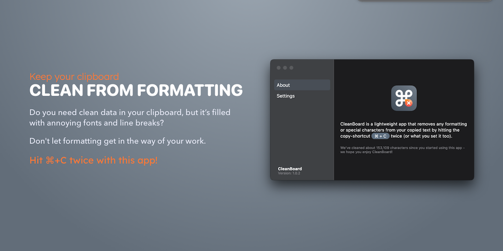 CleanBoard is a Mac app that simplifies your copy-and-paste process by removing formatting from the clipboard. Avoid formatting when copying by hitting Command + C twice, and CleanBoard automatically