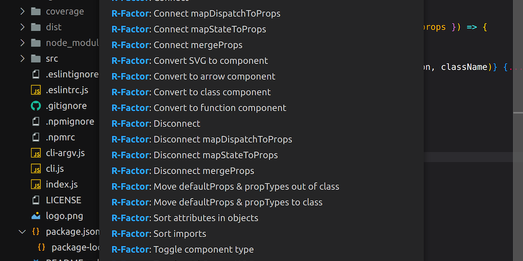 R-Factor is a free and open-source set of React & Redux refactoring tools. It features 20 refactorings & 16 configuration options. Extensions for Visual Studio Code, Sublime Text & Atom available.
