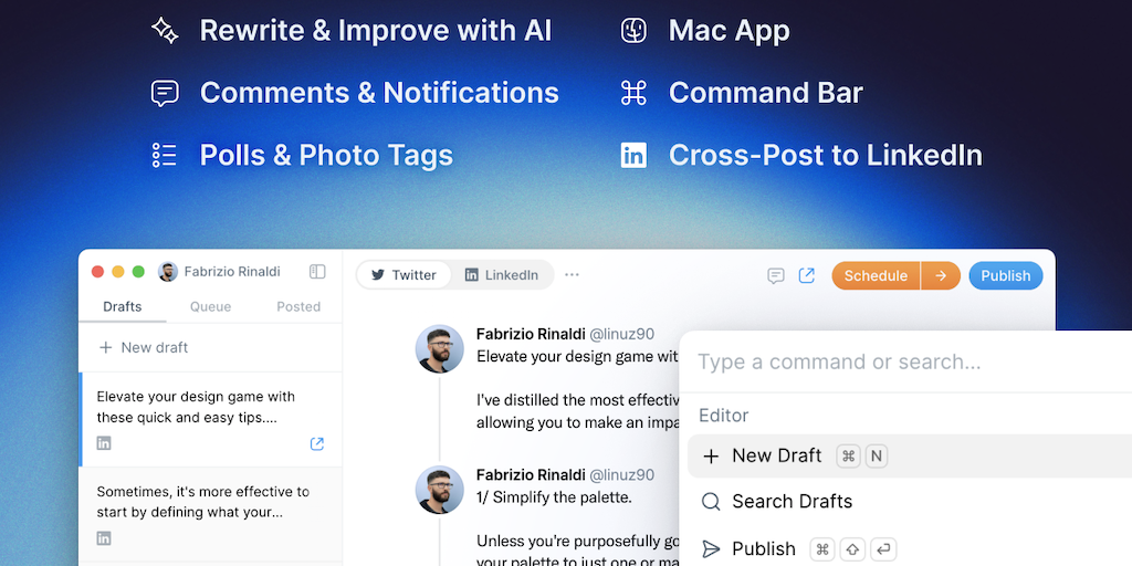 We've worked hard on the new version of Typefully, which is now used by more than 100,000 creators. Rewrite and improve your content with AI. Cross-post to LinkedIn. Become more productive with a Comm