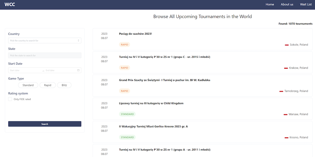Our goal is to provide everyone with an opportunity to find them a chess tournament in any country they want to play at a time and not only a cool big one, which you can find anywhere, but all the loc